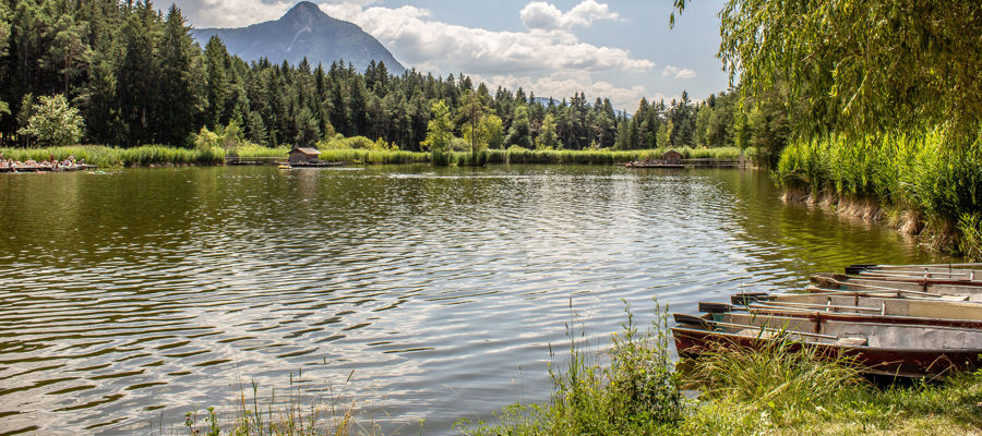 In summer, the pond near Völs am Schlern is perfect for swimming and rawboat tours.