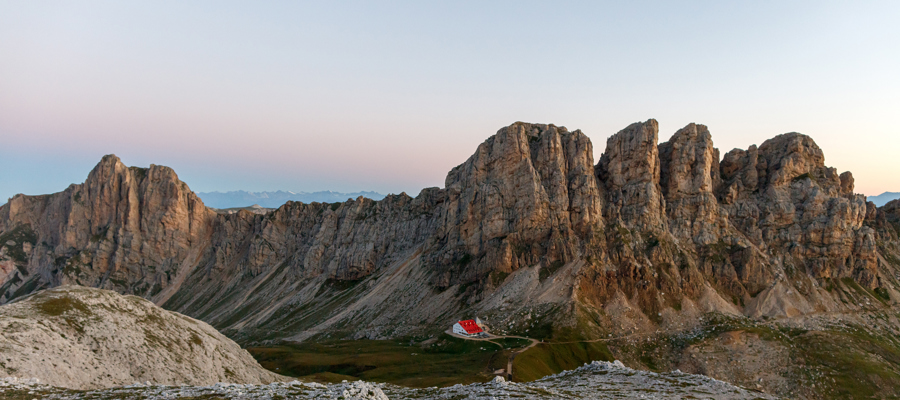 Vanaf de bushalte Saltria op de Seiser Alm (1.650 m) neemt u het bos- en weidepad nr. 7A tot aan de Zallinger hut (2.050 m). Dan volgt een steile klim over pad nr. 9 naar de Plattkofl-hut. Hier begint de eigenlijke Friedrich August Trail (nr. 4 en 557). Het pad is hier en daar smal en er zijn een paar korte gezekerde stukken, maar verder is het niet moeilijk. Je bereikt de Sandro Pertini hut met een prachtig uitzicht op de Plattkofl. Uiteindelijk bereik je de Friedrich August hut, gewijd aan de Saksische koning en Dolomietenliefhebber Friedrich II. Vanaf daar ga je verder richting Passo Sella over een brede bosweg met uitzicht op de Sassolungo en de Steinernes Stadt.